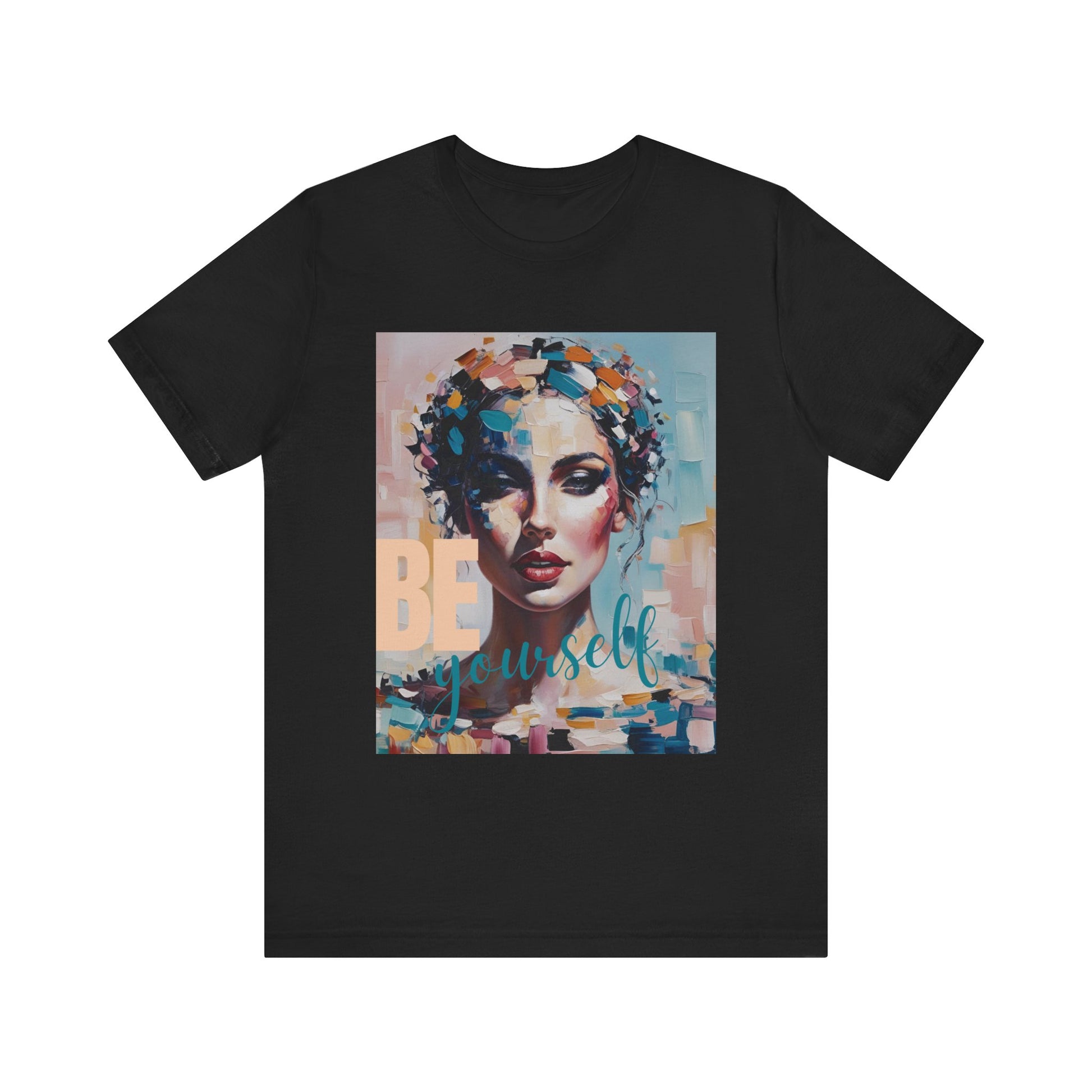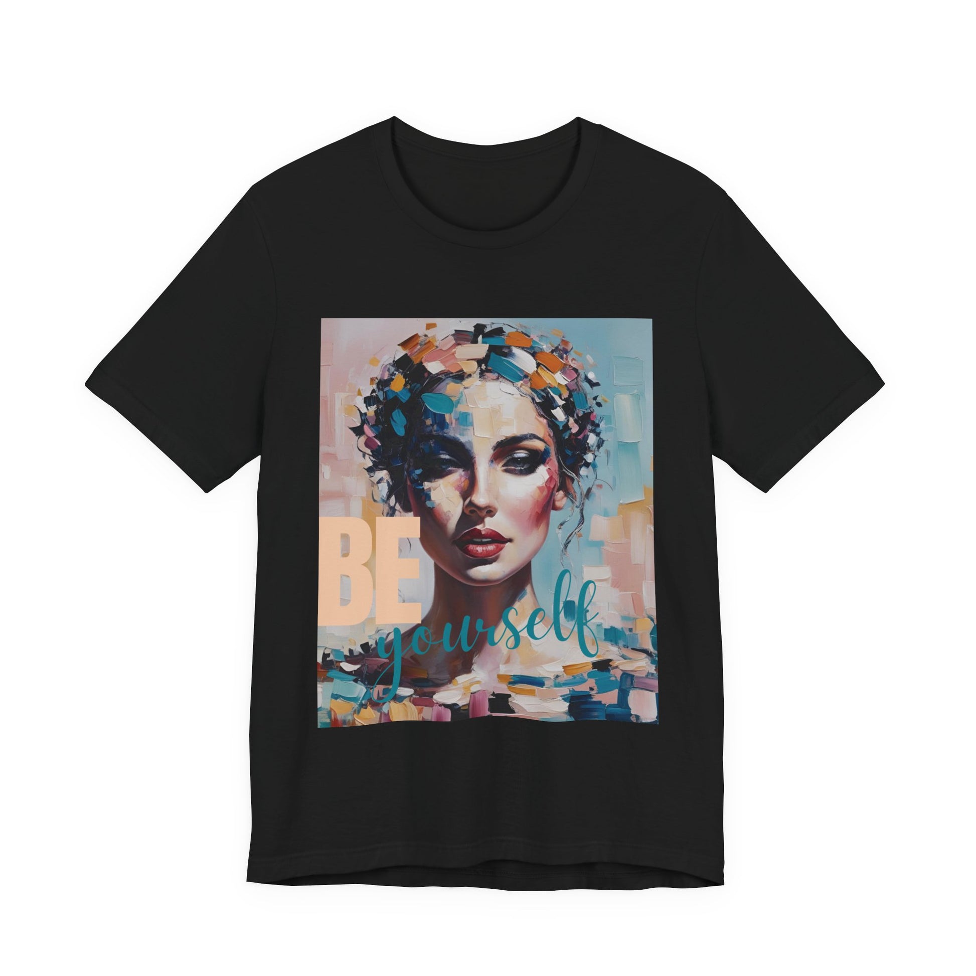 BE Yourself Artistic Women's T Shirt, Inspirational Graphic Tee, perfect for casual wear. A great gift for art lovers, this motivational shirt can elevate everyday fashion and add a touch of creativity to any outfit. The tee exudes a positive vibe and is perfect for creative women who appreciate art and daily inspiration. Ideal for birthdays and holidays