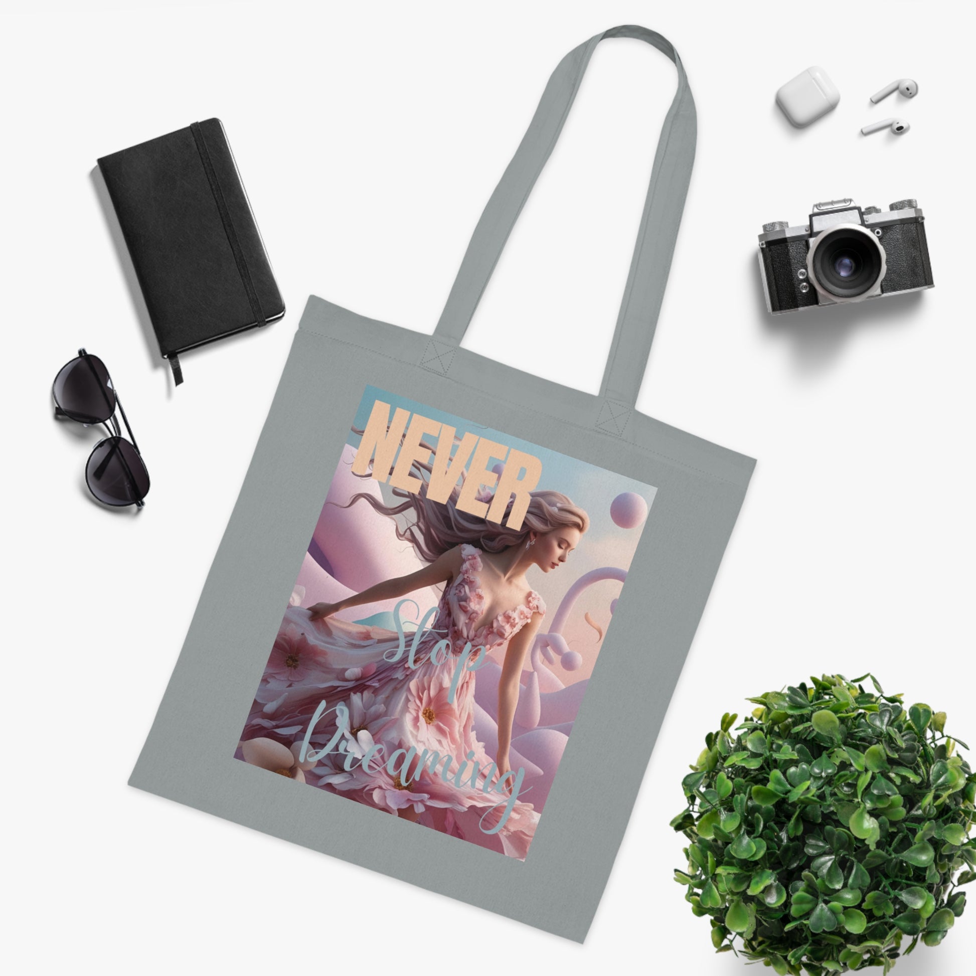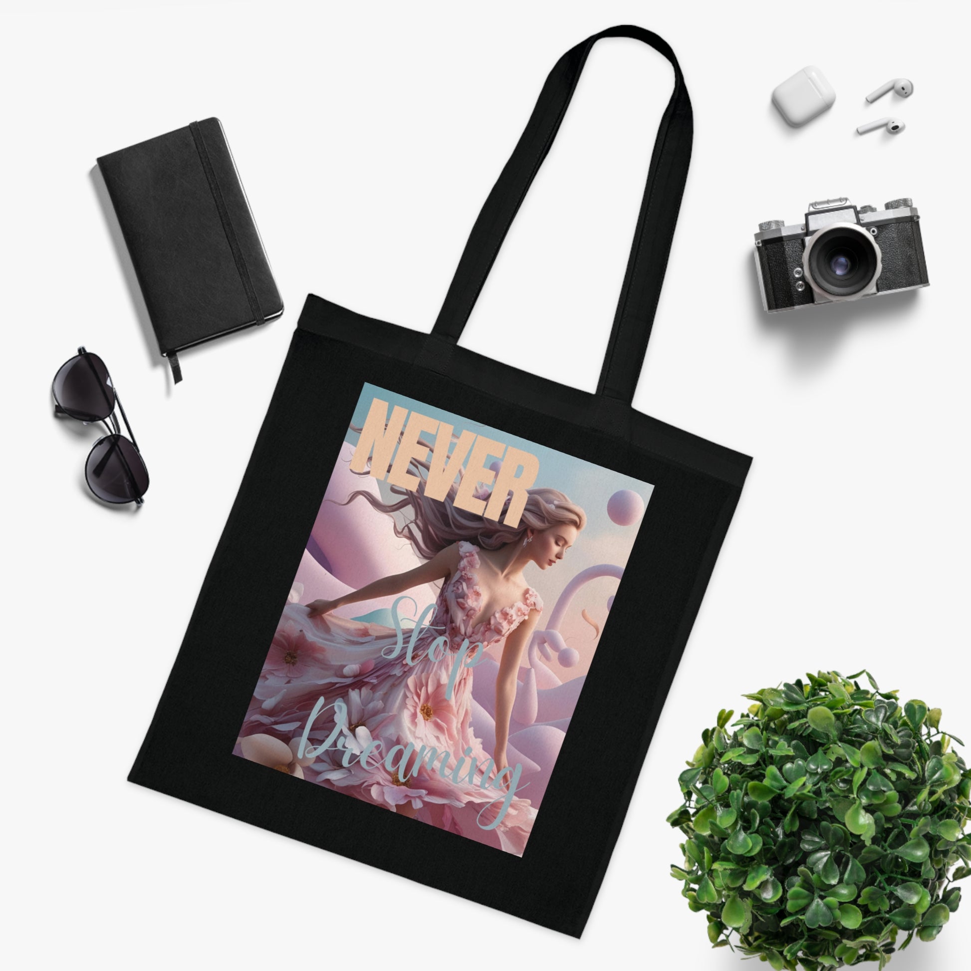 This feminine and dreamy tote bag with the message 'Never Stop Dreaming' is perfect for those who love a touch of whimsy in their everyday life. It is ideal for girls or women who enjoy expressing their creativity and carrying their essentials in a stylish way. This tote bag is idea as a gift for Birthdays, Mother's Day or Christmas.